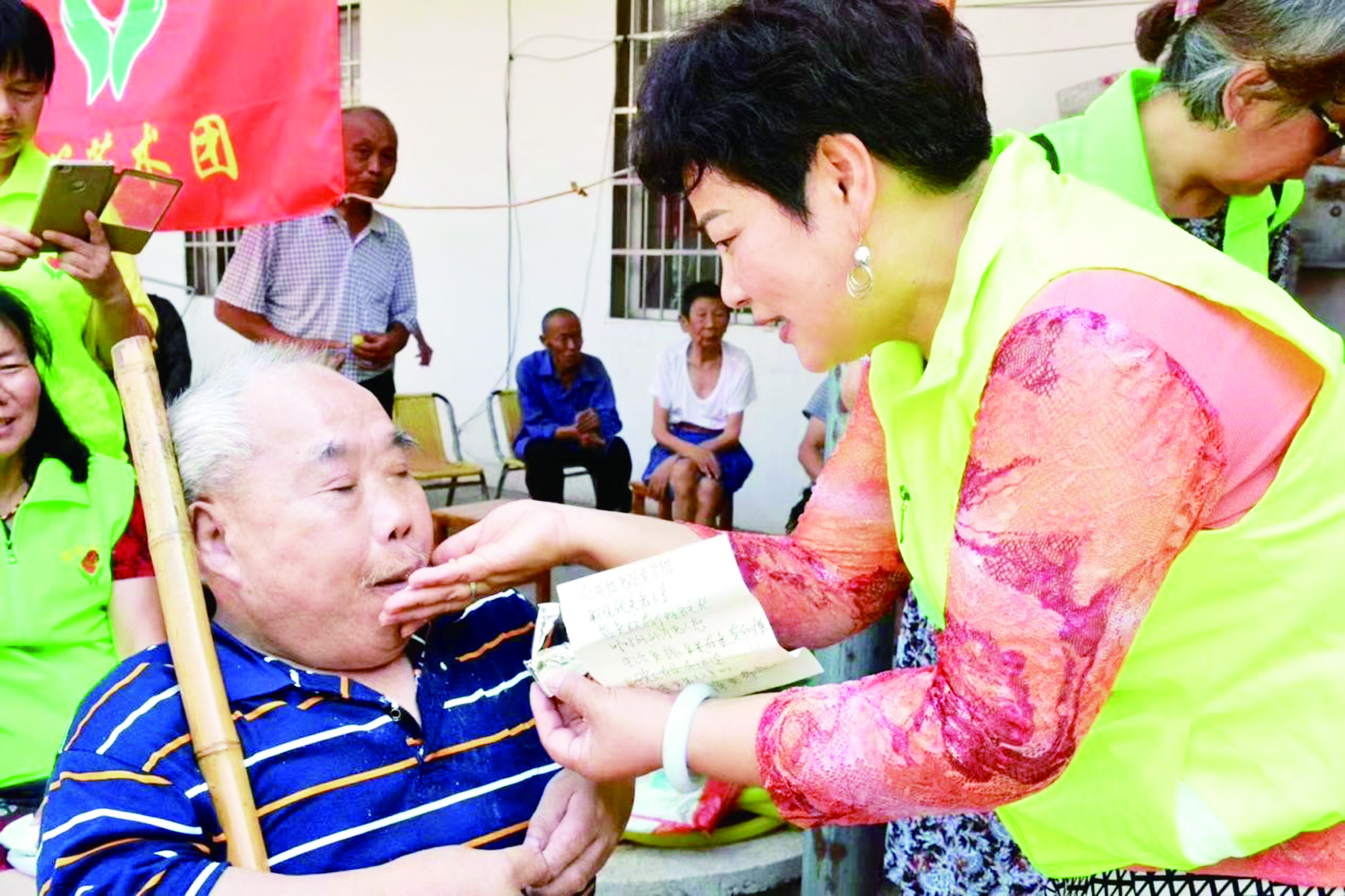 ▲张满珍(右)到敬老院照顾老人。通讯员供图