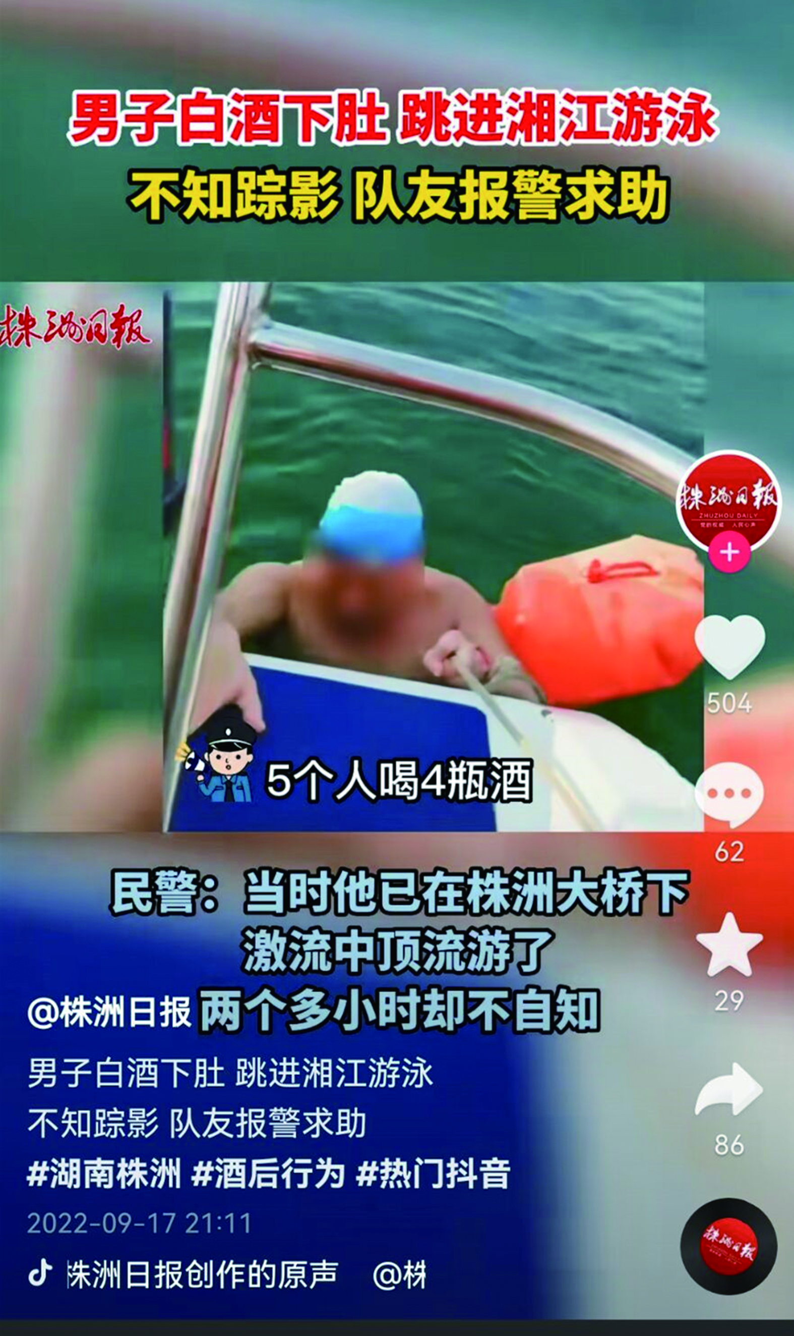 9月16日,湘江株洲段发生惊险一幕:一男子喝醉酒后下水野泳,两个多小时不见上岸,好友随即报警求助。在当地公安民警和泳友们的搜救下,将男子成功救上岸。