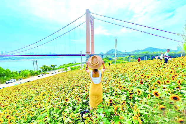 9月19日,湖北省宜昌市点军区点军大道13万余株向日葵盛开,吸引众多游客前来赏花。成片的向日葵宛如一片“葵海”,与游客、长江、大桥一起构成一幅浪漫的风景画。宜昌市点军区位于长江之滨,今年以来,当地融合“农文旅”多元发展,深入推进乡村振兴,通过打造“最美门户要道”,让民众享受更多绿色福利。 (据中新社)