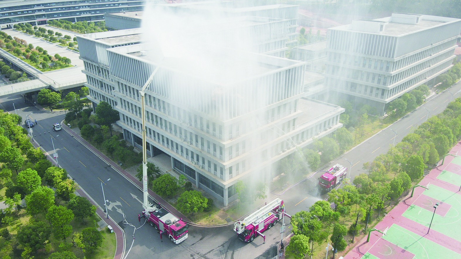 紧急疏散后,全体师生现场观摩了消防灭火实战演练。演练设置学校艺术楼4楼发生火灾,有人员被困。职教城消防救援站消防员冲进火场灭火,高喷消防车射水压制火势,云梯消防车伸展至楼顶营救被困人员。消防演练结束后,消防员还向师生们传授火灾自救技能。