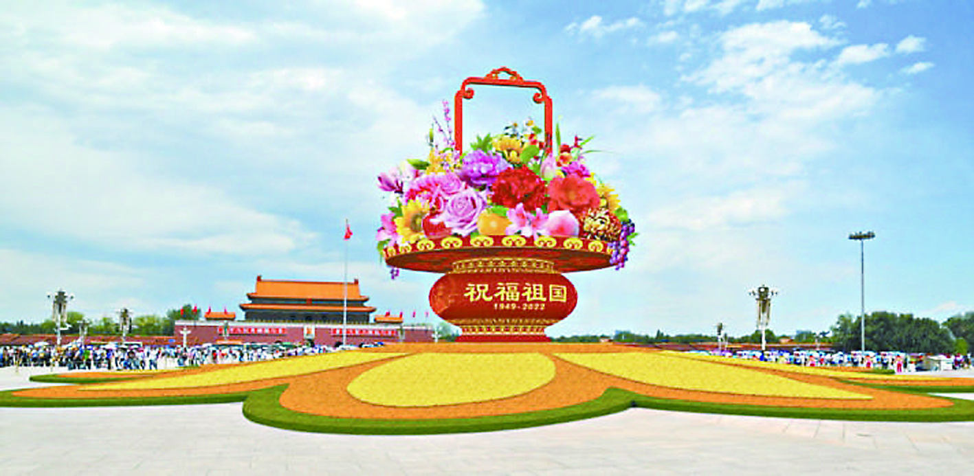 花坛底部直径48米,为向日葵图案,寓意朵朵葵花向太阳。花篮篮体南侧书写“祝福祖国,1949-2022”,北侧书写“喜迎二十大”。二十大会议期间,“喜迎二十大”将更换为“喜庆二十大”字样。