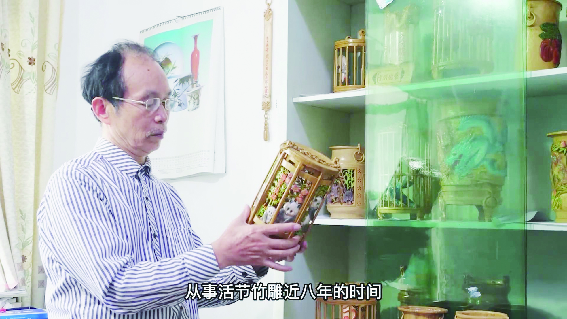▲黄立雄与他的竹雕作品。(视频截图)