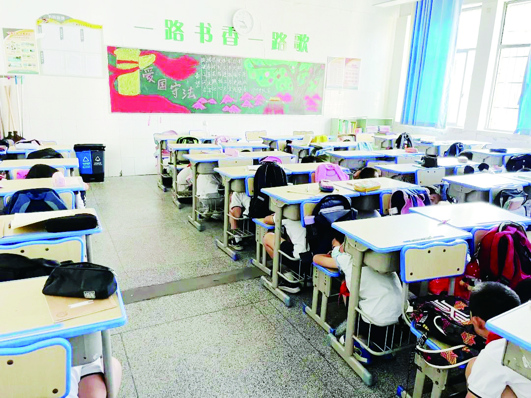 ▲同学们迅速躲避到座位下。 通讯员供图