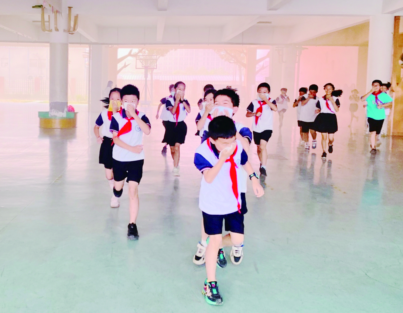▲烟雾中,同学们迅速撤离。 通讯员供图