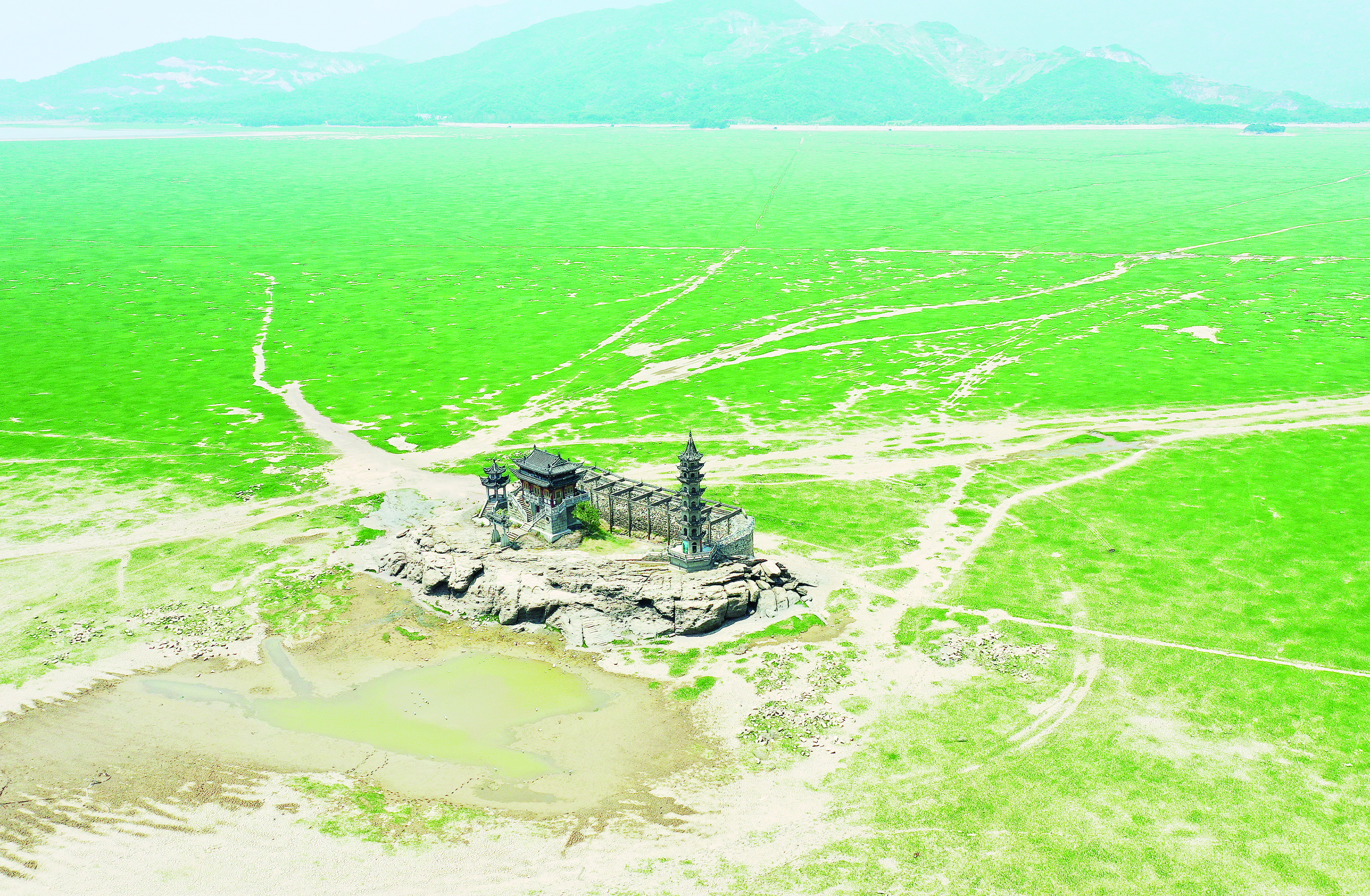 ▲鄱阳湖水位下降,湖区的落星墩完全展露出来(今年8月摄)。 据新华社