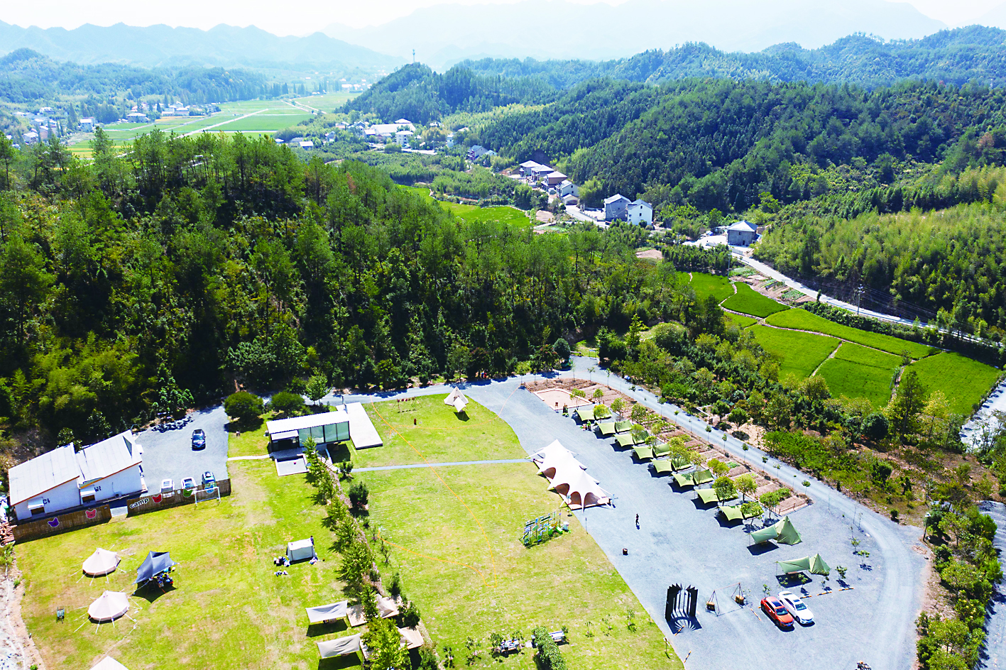 9月24日,空中俯瞰位于杭州市临安区太阳镇上庄村的牧光谷露营基地,该基地是2022年5月刚投入运营的网红露营基地,带动周边30余名农户就业(无人机照片)。
