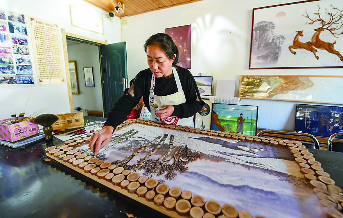 内蒙古兴安盟阿尔山市地处大兴安岭脊中段,以白桦树和松柏树为主的林木资源丰富。当地群众利用白桦树树皮作画,辅以苔藓、干花、树叶等材料,通过剪、刻、雕、画等技法,制作出极具特色的树皮画。