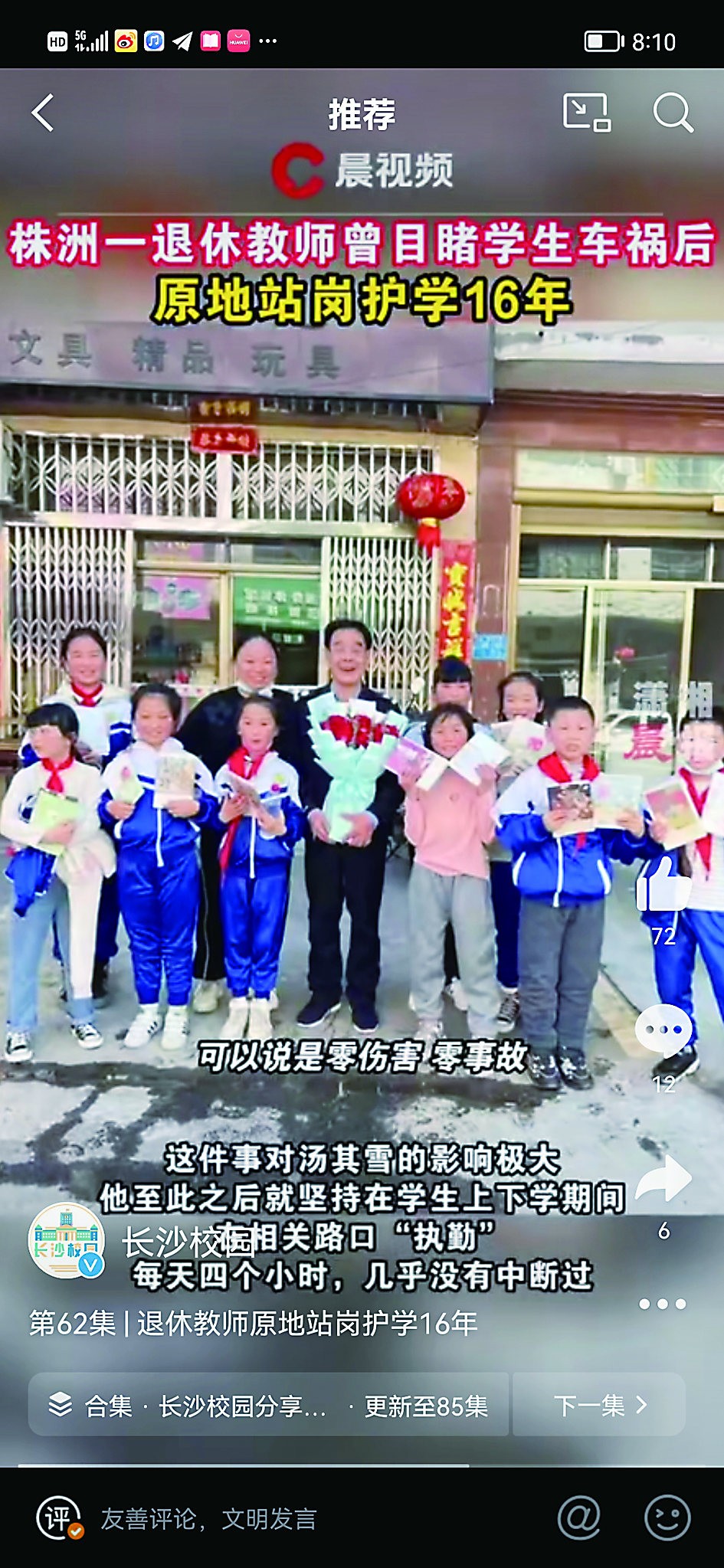65岁的汤其雪退休前是一名乡村小学教师,因目睹两位学生出车祸,他坚持在原地义务护学16年,守护学生过马路。近日,9月“湖南好人”候选人名单出炉,护学老人汤其雪入选助人为乐类“湖南好人”候选人。人民日报、央视新闻纷纷发稿,为汤老师点赞。