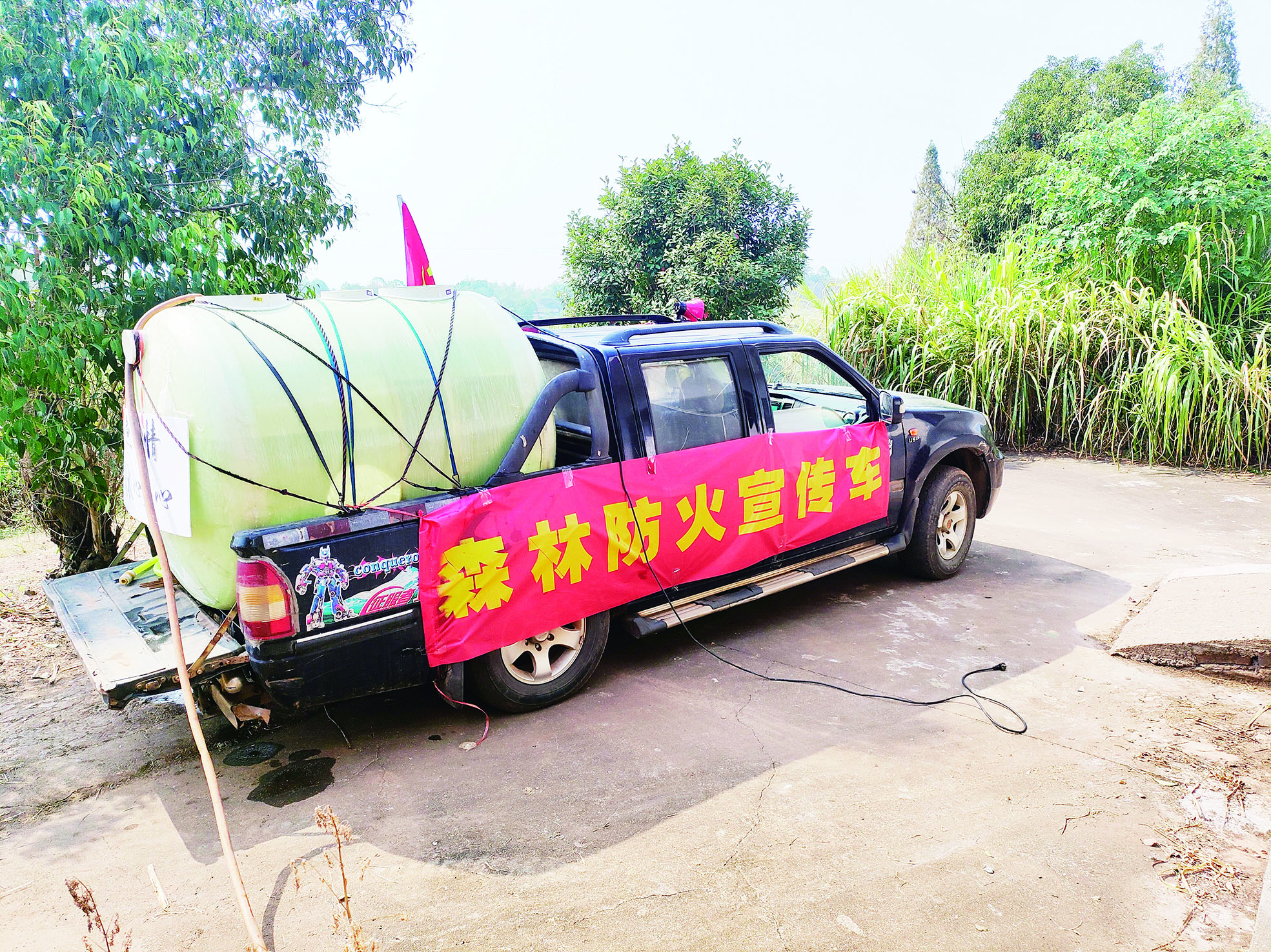 这辆车由南江村党员吴术安无偿提供,车顶上放有森林防火宣传小喇叭,车后放着储水的水箱,两项工作同时开展。