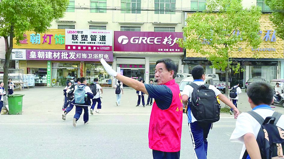 ▲汤其雪在王仙镇的学校路口护学。 通讯员供图