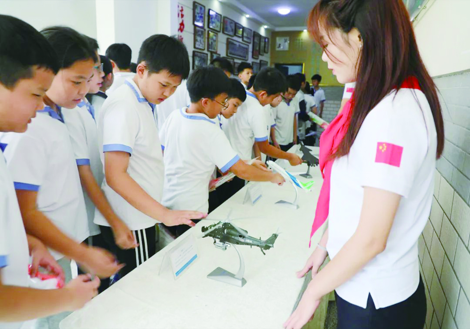 “鲲鹏”运-20、“威龙”歼-20、“霹雳火”武直十……各式各样的飞机模型整齐地排列在展台上,炫酷的造型瞬间“击中”了孩子们的心。