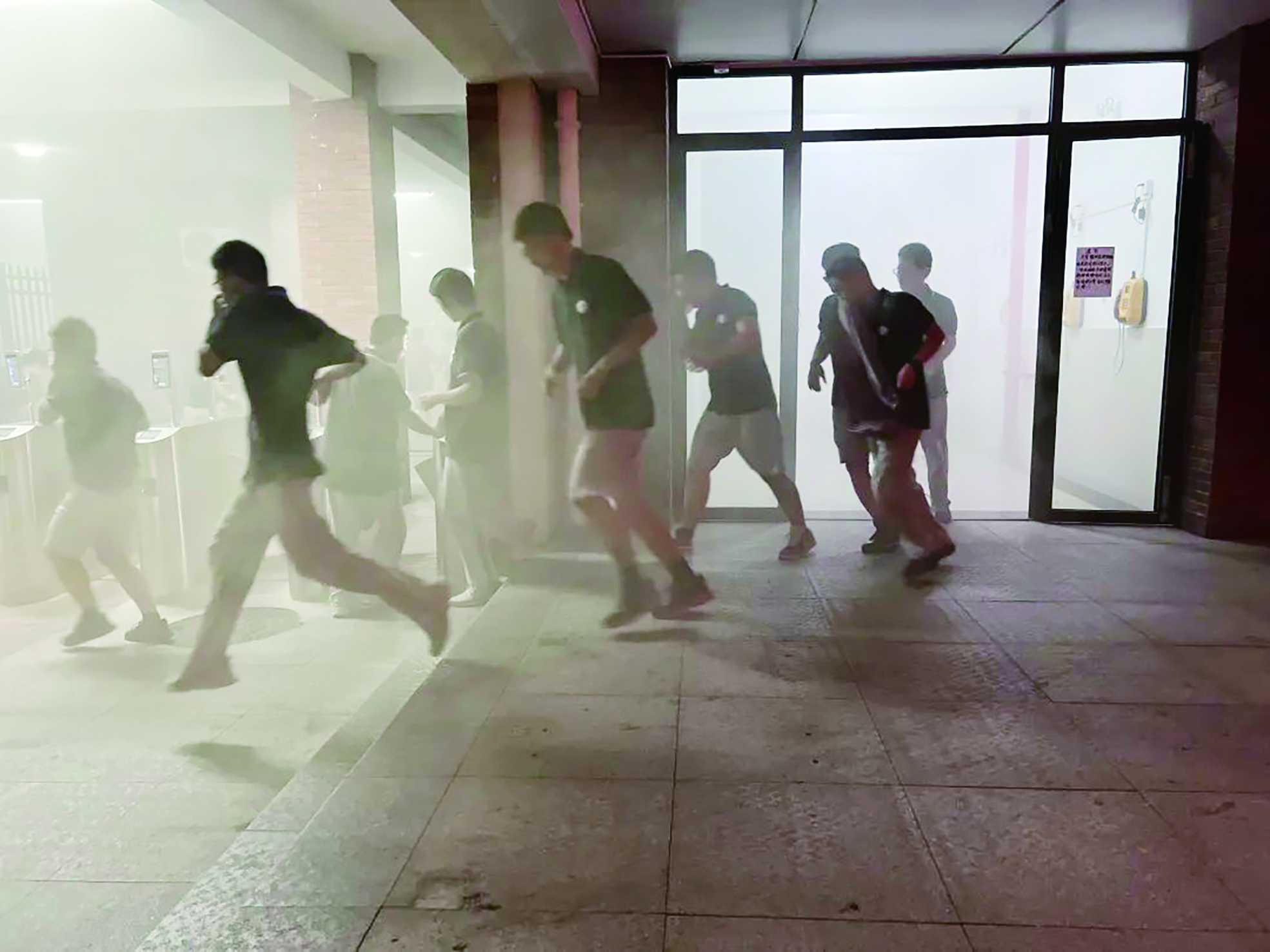 为增强寄宿生夜间消防安全意识,提高夜间消防应急逃生能力,该校还开展了寄宿生夜间消防应急逃生演练。随着消防警铃长鸣,浓烟渐起,同学们在老师的组织下手捂口鼻、弯腰,有序快速地跑出宿舍,按预设的逃生通道撤离到安全地带。随后,消防教官结合演练实际,对此次活动进行了总结点评。