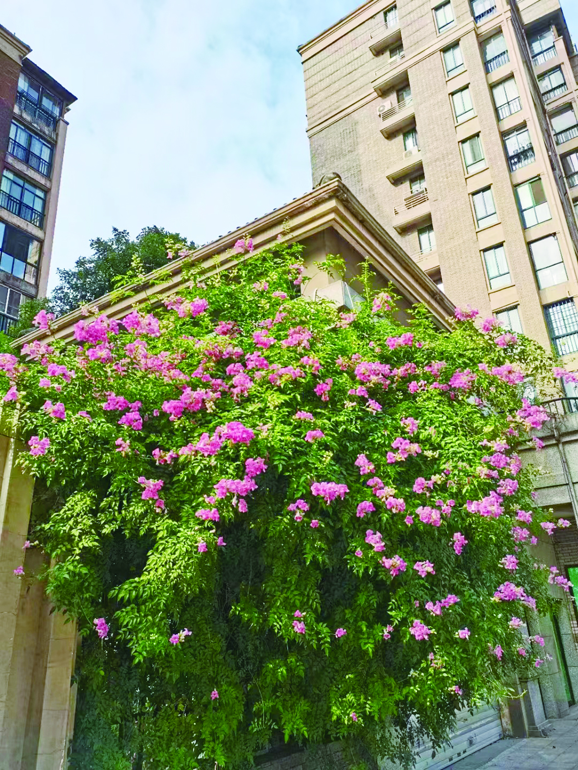 一朵朵、一簇簇粉红色的小花点缀在层叠的树叶之间,阳光下,花朵仿若自带光亮闪烁。这两株开在尚格名城小区后门围墙边的凌霄花,是业主王先生一家,在看到小区围墙破损后,自发种下的。如今,凌霄花不仅为小区增添了美景,还吸引不少路人拍照打卡。