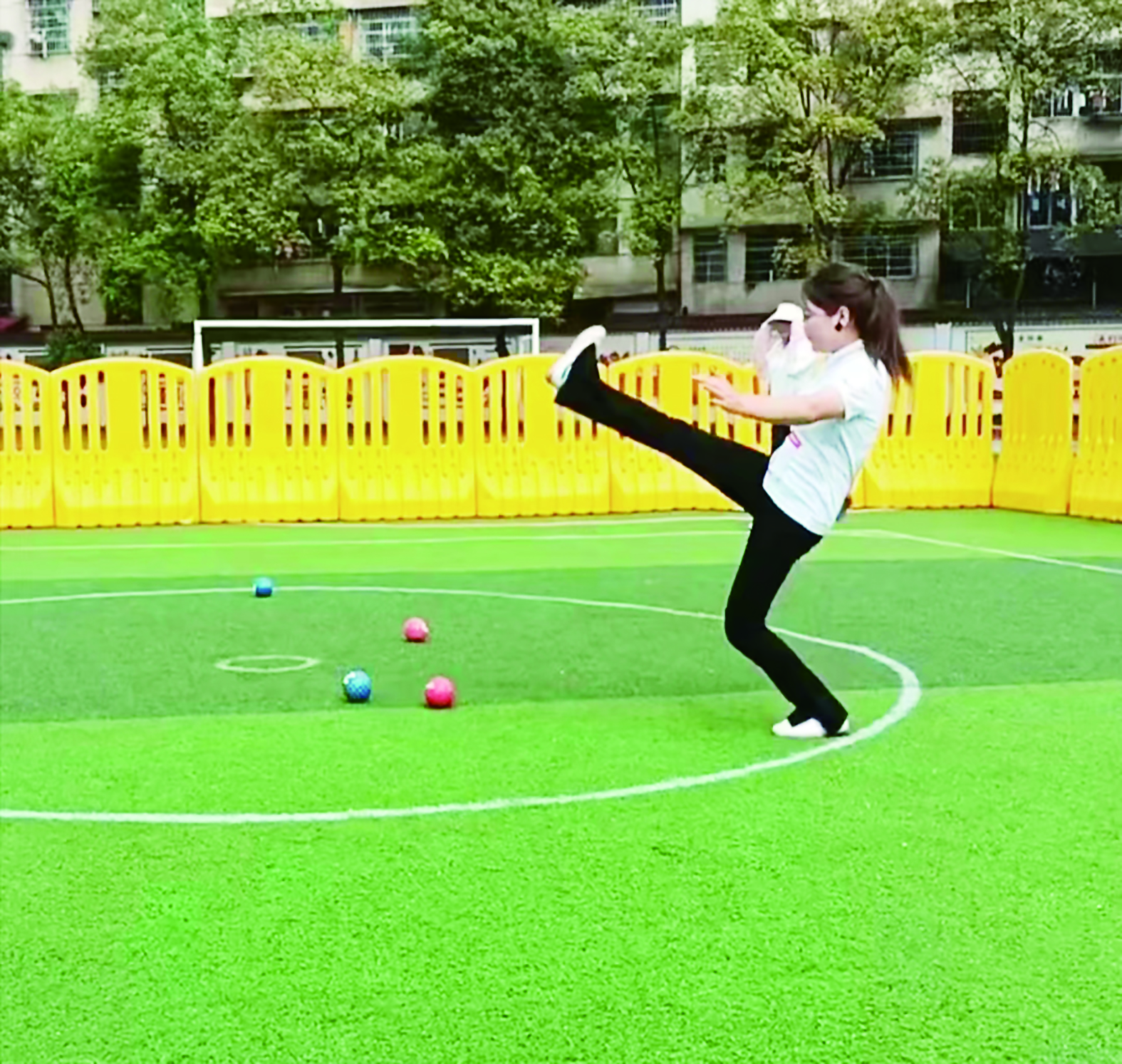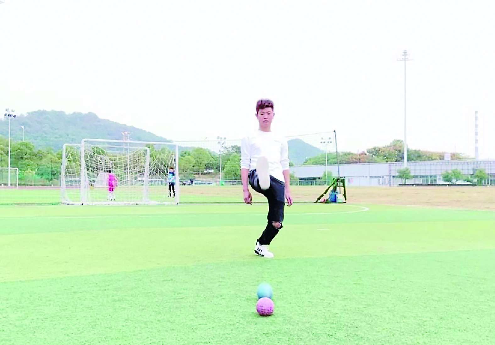 瞄准目标球,右脚、本球、目标球三点一线,两脚摆成30°角站立,右脚前脚掌将本球轻轻压住,再次瞄准并调整呼吸,随即本球由脚前掌到脚后跟蹴出,“砰”——准确命中目标球。昨日,在位于河西的市体育中心足球场,雷冰和队友雷易勤向记者演示了蹴球的踢法。