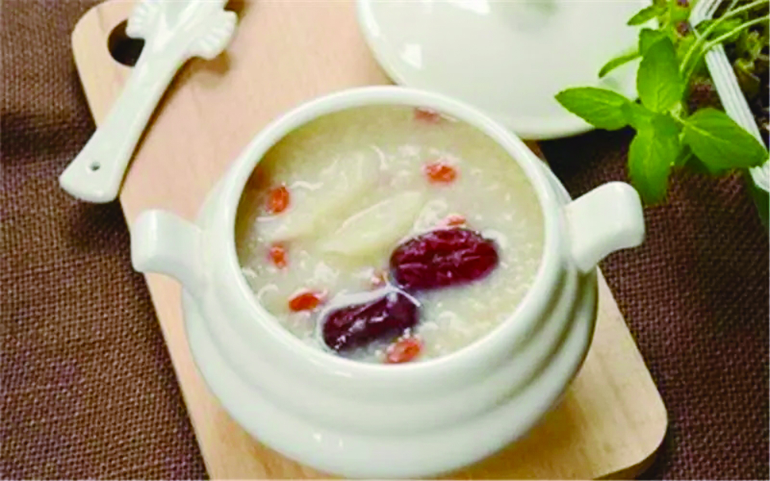 百合大枣粥:取山药90克,百合40克,大枣15枚,薏仁30克及大米适量。将所有材料洗净,加水一起煮粥,每天喝两次。此粥有滋阴、润肺、养胃的功效。