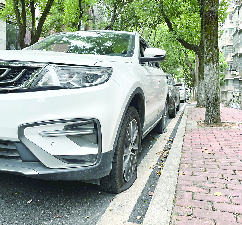 ▲一辆停在师专小区路边的私家车,有两个车胎遭放气。 记者/刘平 摄