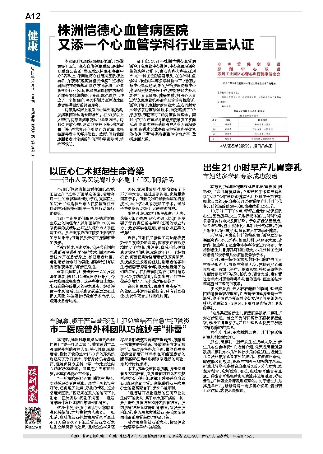 株洲恺德心血管病医院 又添一个心血管学科行业重量认证