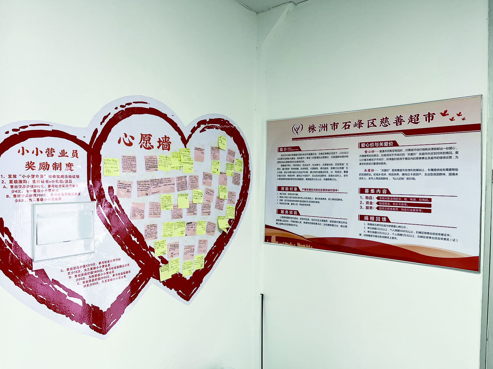 慈善超市内设有“心愿墙”,有需要帮助的困难群众可以将自己的“微心愿”张贴在“心愿墙”上,将有热心人士认领。