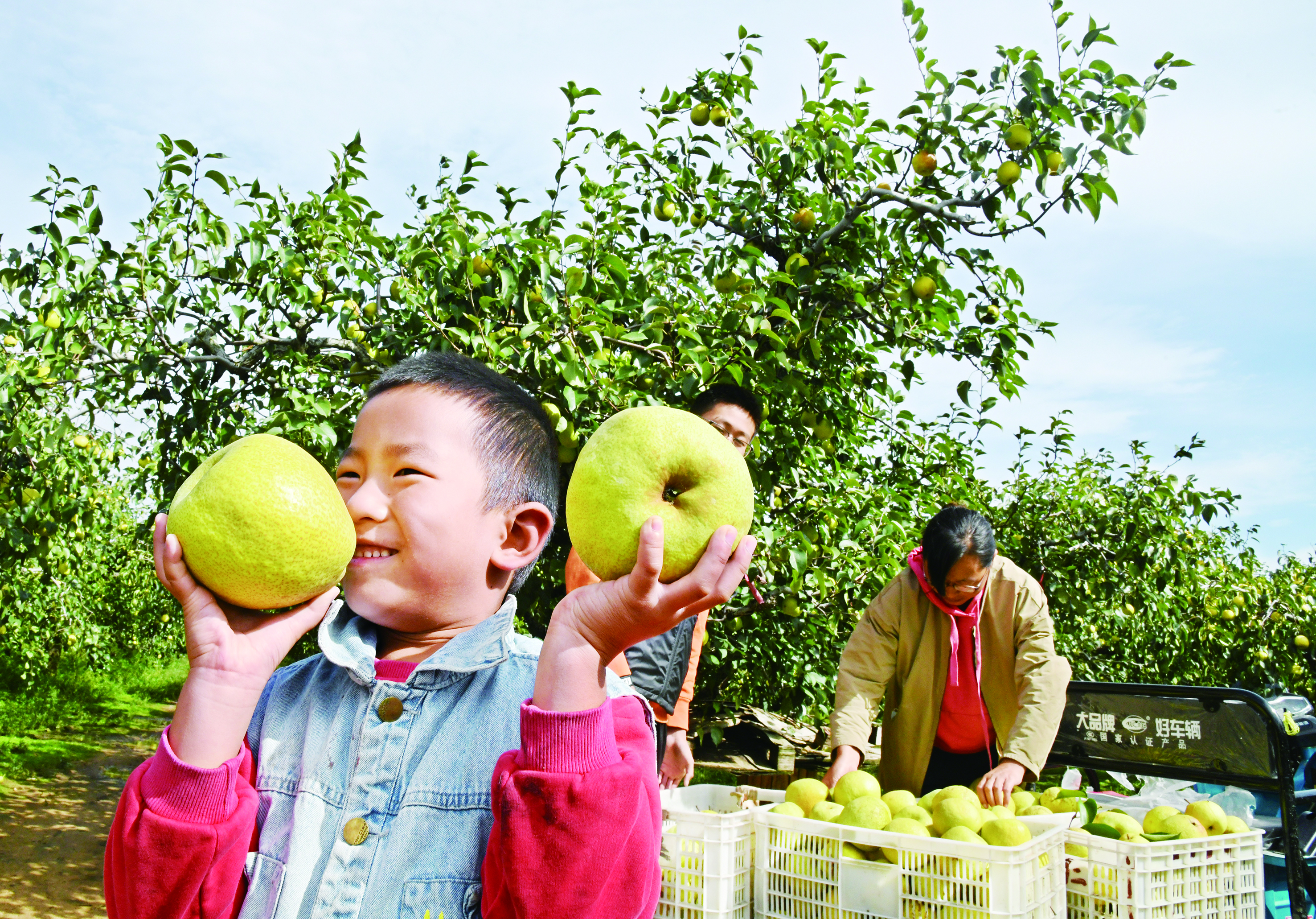 ▲10月4日,山东青岛西海岸新区王台街道石梁刘村一处梨园里,一名小朋友举着刚采摘的果实。