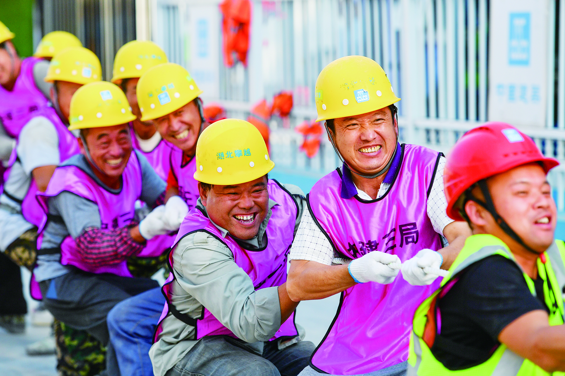 ◀10月5日,济南市唐冶(三甲)医院工程项目现场,参与施工的中建三局集团有限公司(山东)建设者们进行工友趣味比赛,欢度国庆假期。
