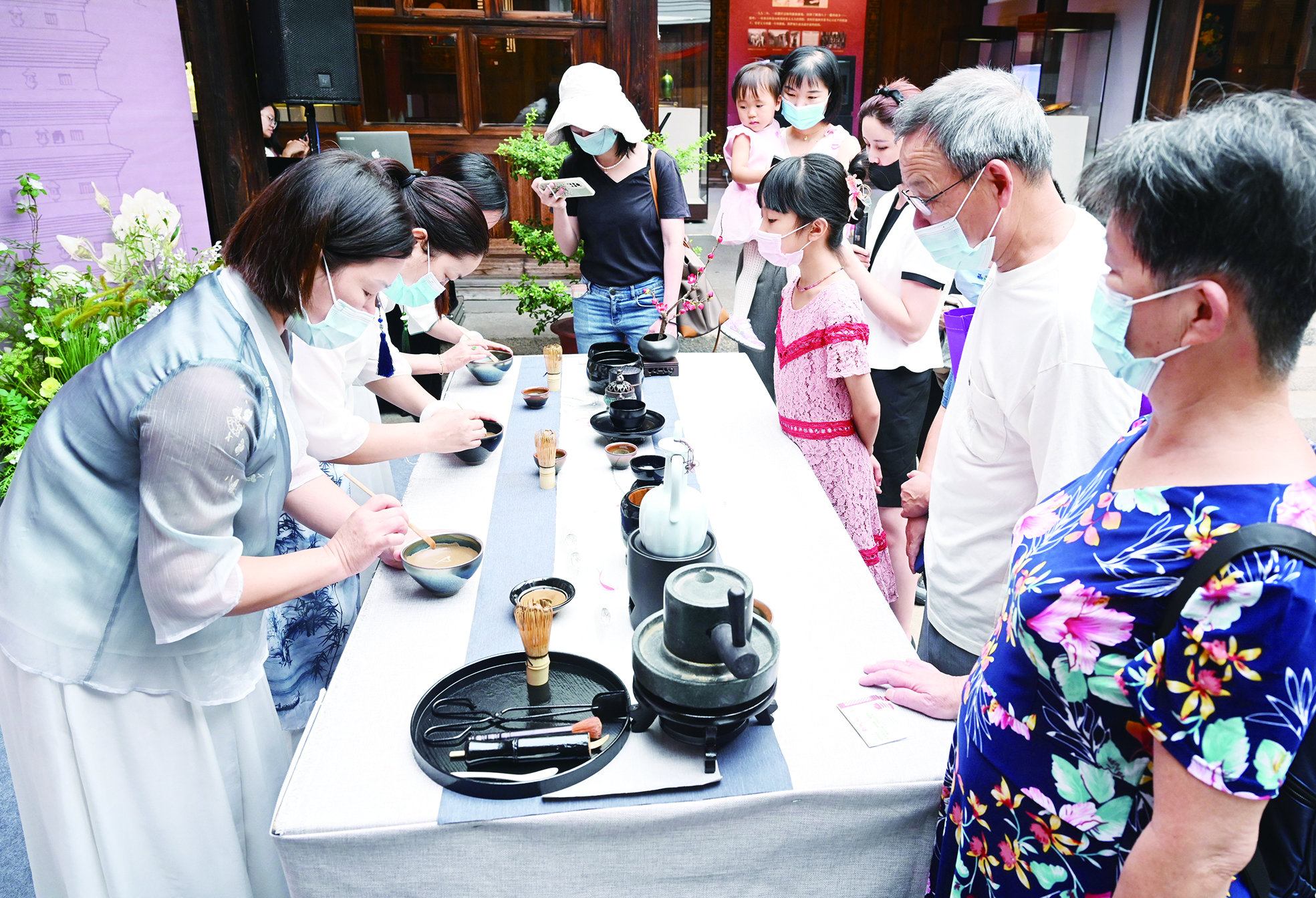 ◀10月7日,游客在福建省非物质文化遗产博览苑观看宋代点茶和茶百戏表演。