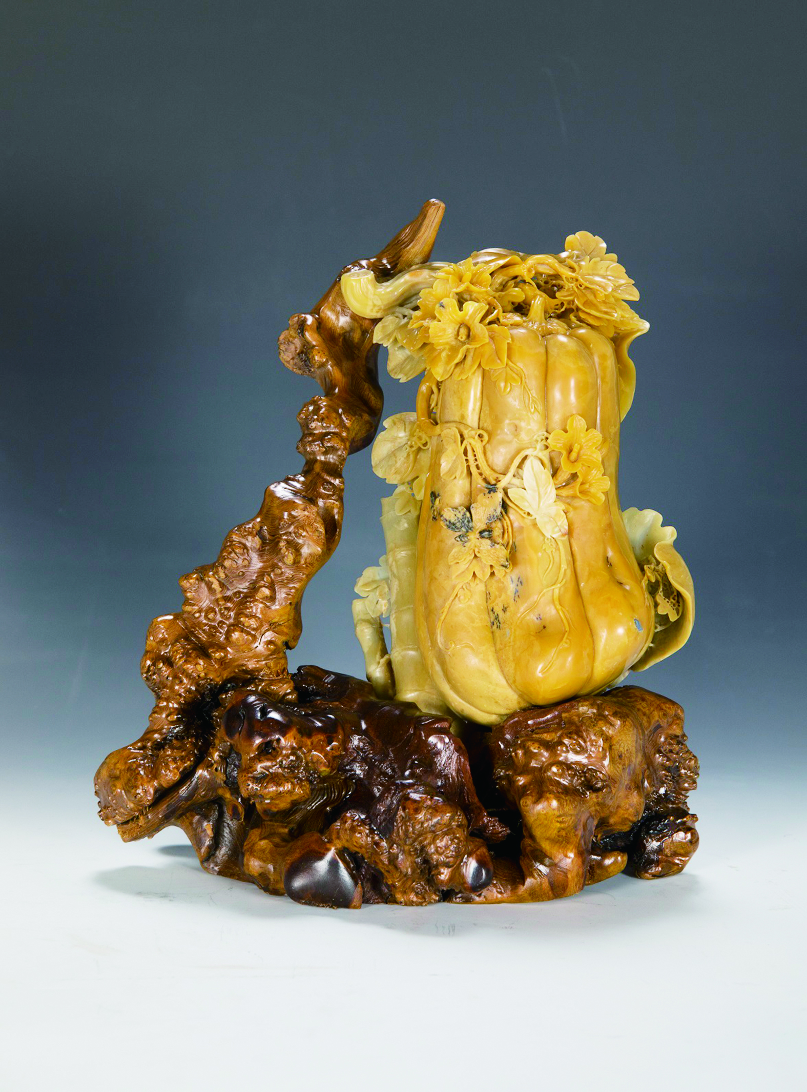 青田石产于中国东部浙江省的青田县,这里历来被人们称为“中国石雕之乡”。青田石雕工艺发端于六朝时期,有相石、开坯、雕琢、封蜡、润色等工序,尤以镂雕技艺见长,且圆雕、镂雕、高浅浮雕、线刻交替使用。青田石雕题材广泛,鱼虫花鸟、山水人物皆有,均精雕细刻,神形兼备,大气之中不失精妙,工艺规范,自成一格。陈小甫的作品《南瓜》运用“因势造型”“依色取巧”的技巧,并发挥青田石自身石色、石质、可雕性的优势,刻画出既写实又尚意,且极具艺术感染力的南瓜。作品具有浓郁的生活气息,细腻精巧,形神兼备。