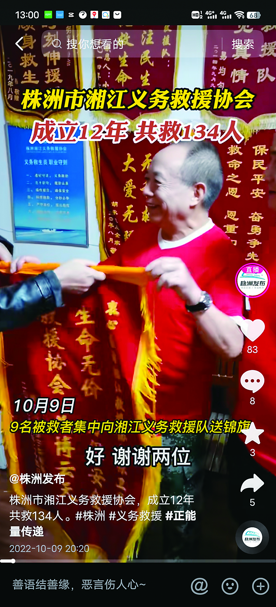 10月9日,9名落水被救者集中向株洲湘江义务救援协会送锦旗。据悉,该协会今年以来在湘江株洲城区段已救援15名落水市民。这支救援队伍成立12年以来,一共在湘江救援134人。协会巡逻时间是下午4点到晚上10点,巡逻的范围是四桥钢琴广场至一桥水域。