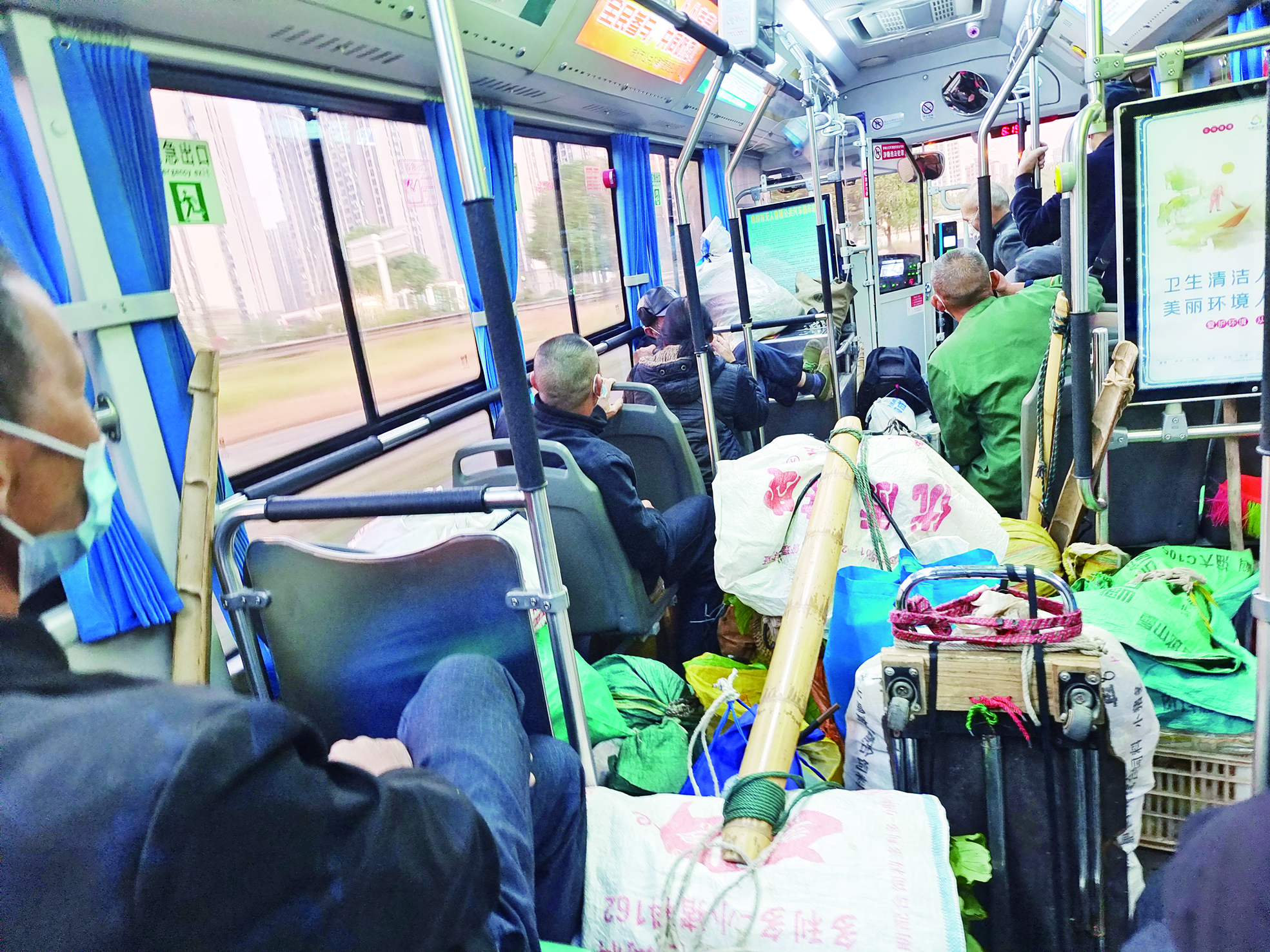 ▲203路车厢过道被菜担塞得满满当当。 记者/廖明 摄