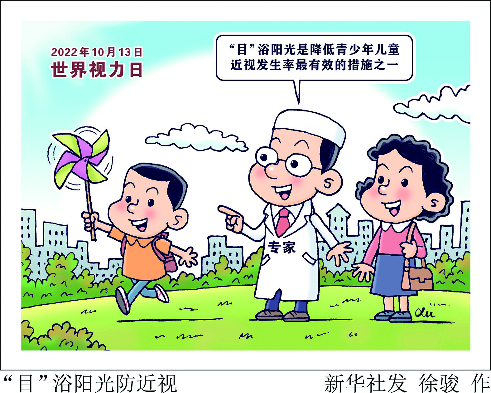 10月13日是今年的世界视力日。专家指出,近年来,青少年儿童近视、弱视、斜视等眼病高发,威胁儿童眼健康,亟待引起重视。保护青少年儿童视力需要家庭、学校、医疗机构形成合力,构建青少年儿童视力保护网。 “目”浴阳光是降低近视发生率最有效的措施之一。专家呼吁,保护青少年儿童视力需要家庭、学校、医疗机构形成合力。家长应帮助孩子从小养成良好的用眼习惯,避免孩子过早接触手机、平板电脑,多带孩子参加户外活动;学校要科学安排体育课,保证学生在户外体育锻炼的时间,帮助学生增强体质,预防近视发生;大型医疗机构可以定期安排眼科专家到基层开展宣讲和诊疗,帮助提升基层儿童近视防控水平。 (据新华社)
