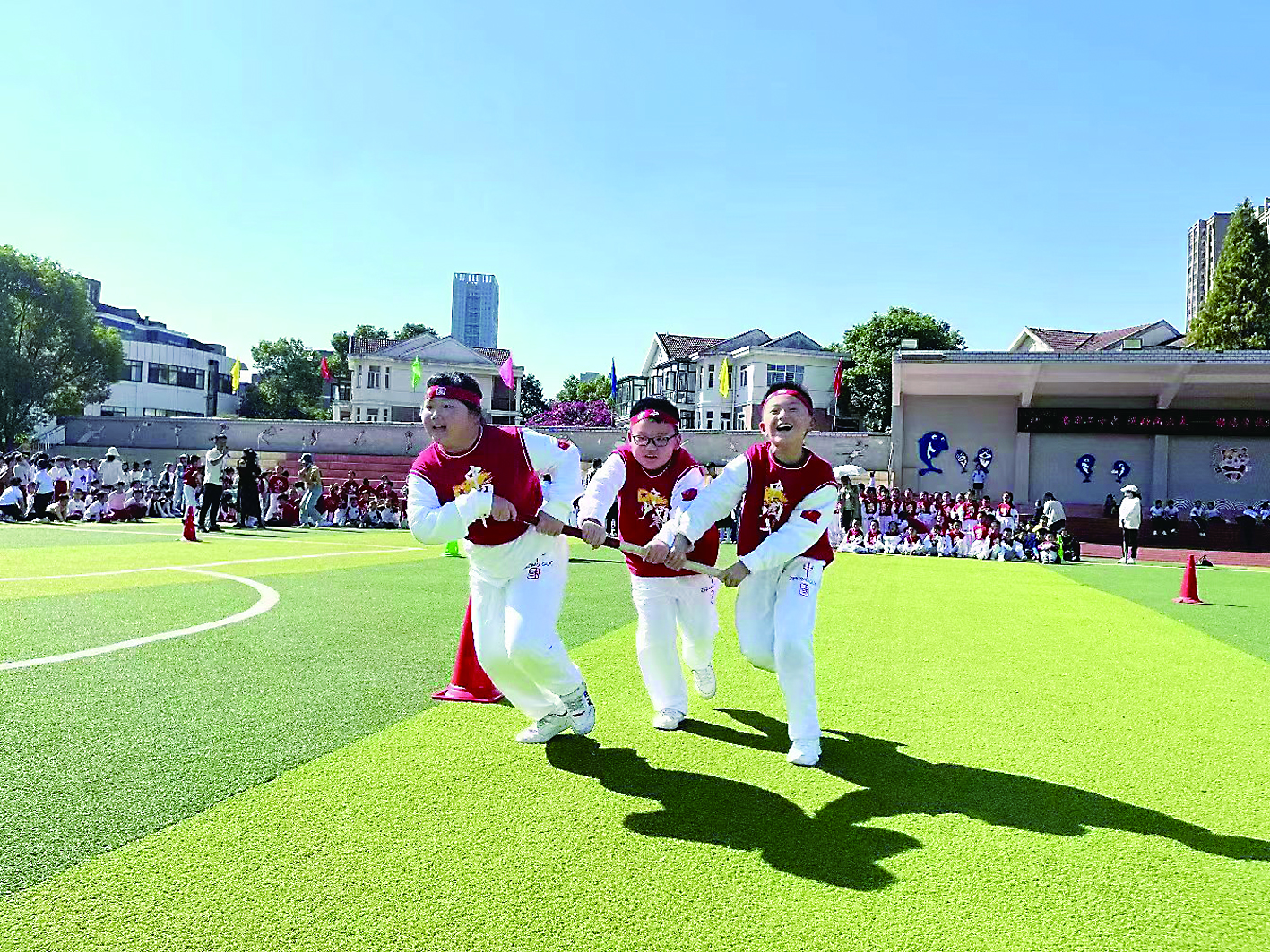 一根小棒连接你我,当三个人成为“一条绳上的蚂蚱”,脚步一致,团结协作才是比赛胜利的“法宝”。图为天元区银海学校趣味运动会现场。