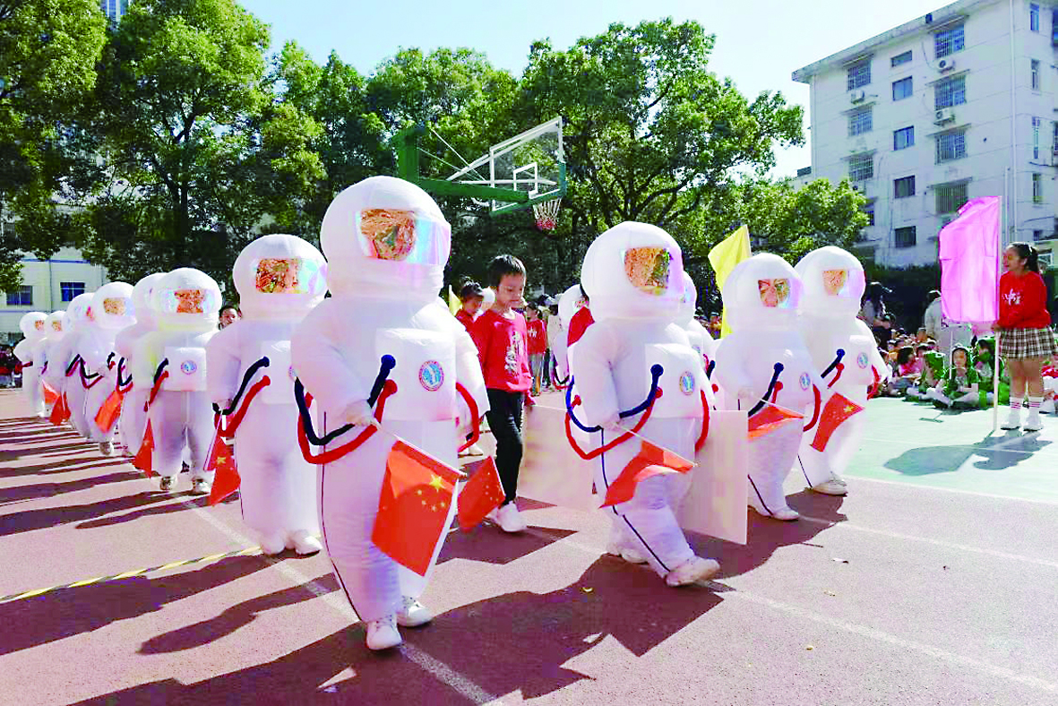 图为2007班的学生,身着宇航员服装,手拿航天运载火箭模型,展示心中的中国航天梦、中国科技梦。