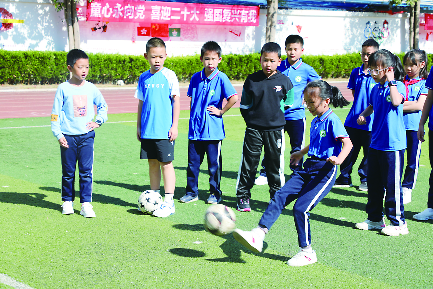 童心永向党,强国复兴有我。谁说女子不如男?足球场上,不止有男同学奔跑的身影,“铿锵玫瑰”的球技也不容小觑。图为天元区白鹤小学学生一脚抽射,将球踢向球门。