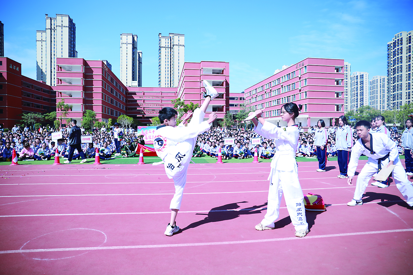 少年强则国强。侧手翻、凌空旋转踢……近日,在天元区菱溪中学校运会上,该校跆拳道社团学生现场表演飞踢木板,现场掌声不断。