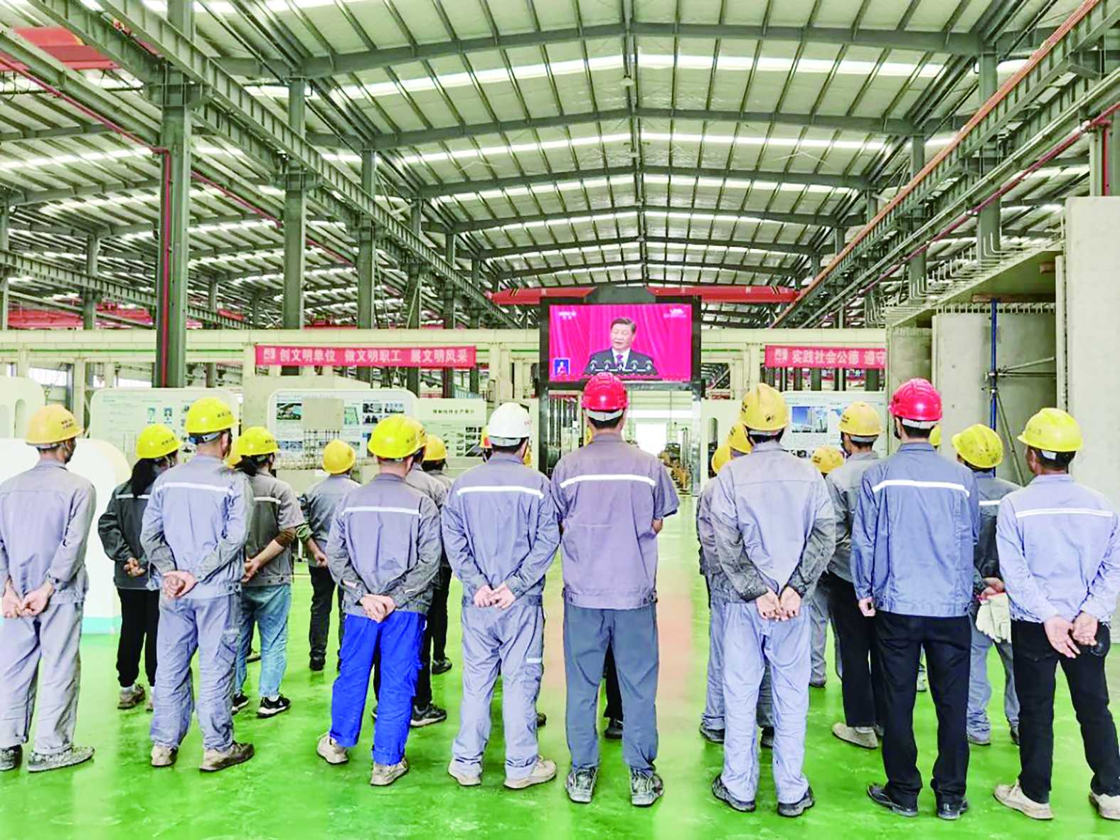 ▲湖南建工五建建筑工业化有限公司产业工人驻足收看党的二十大开幕会。通讯员供图