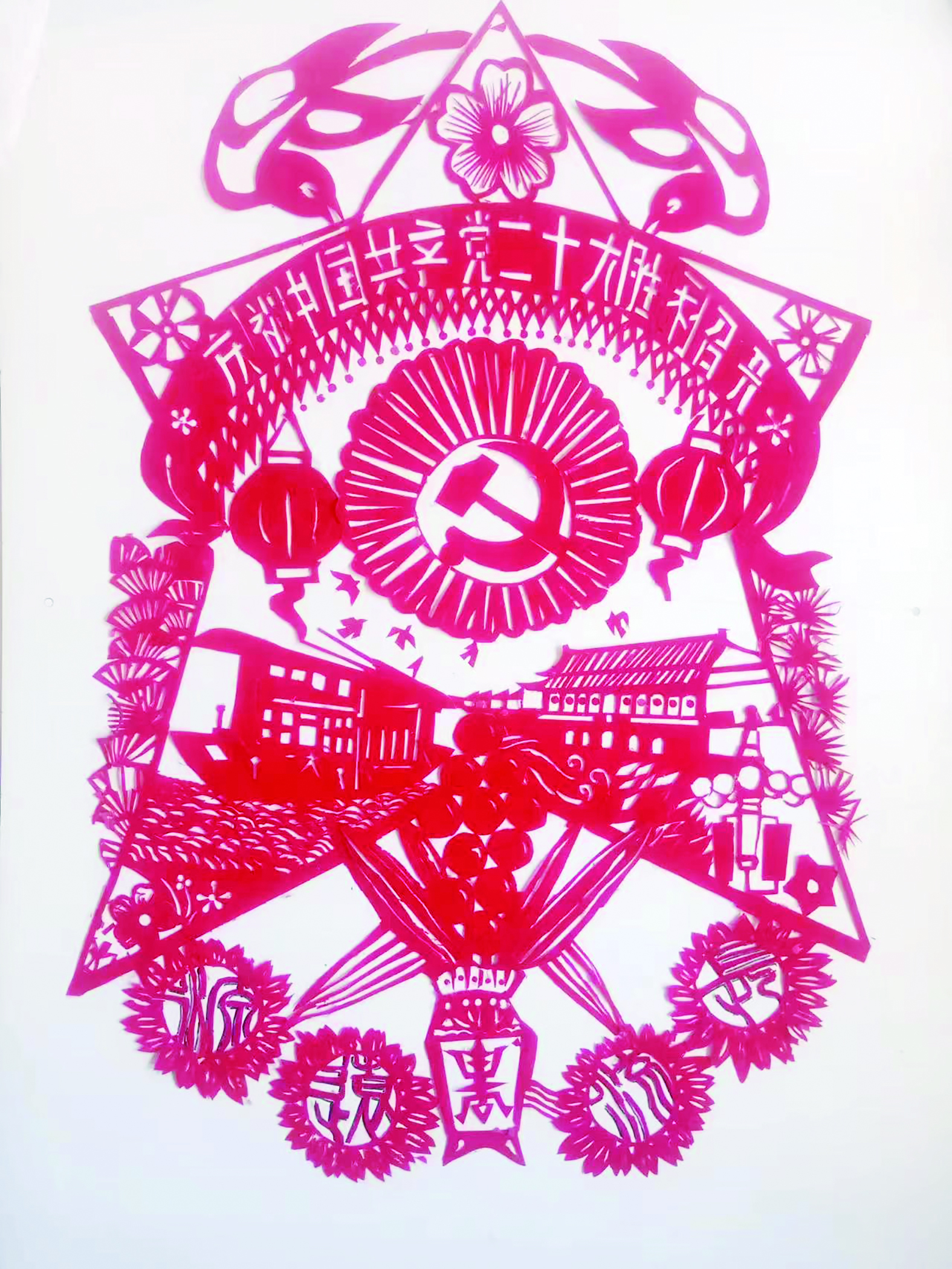 一路走来,罗爹爹创作了不少作品。说起创作“喜迎党的二十大”剪纸作品初衷,罗爹爹表示,看着祖国这些年的巨大变化,心生感激,于是怀着感恩之心创作了这幅作品。在罗爹爹创作的剪纸作品里,一艘红船到北京,青松、喜鹊、彩灯,百花致贺,中心为光芒四射的党徽,表达人民对党的崇敬之情。