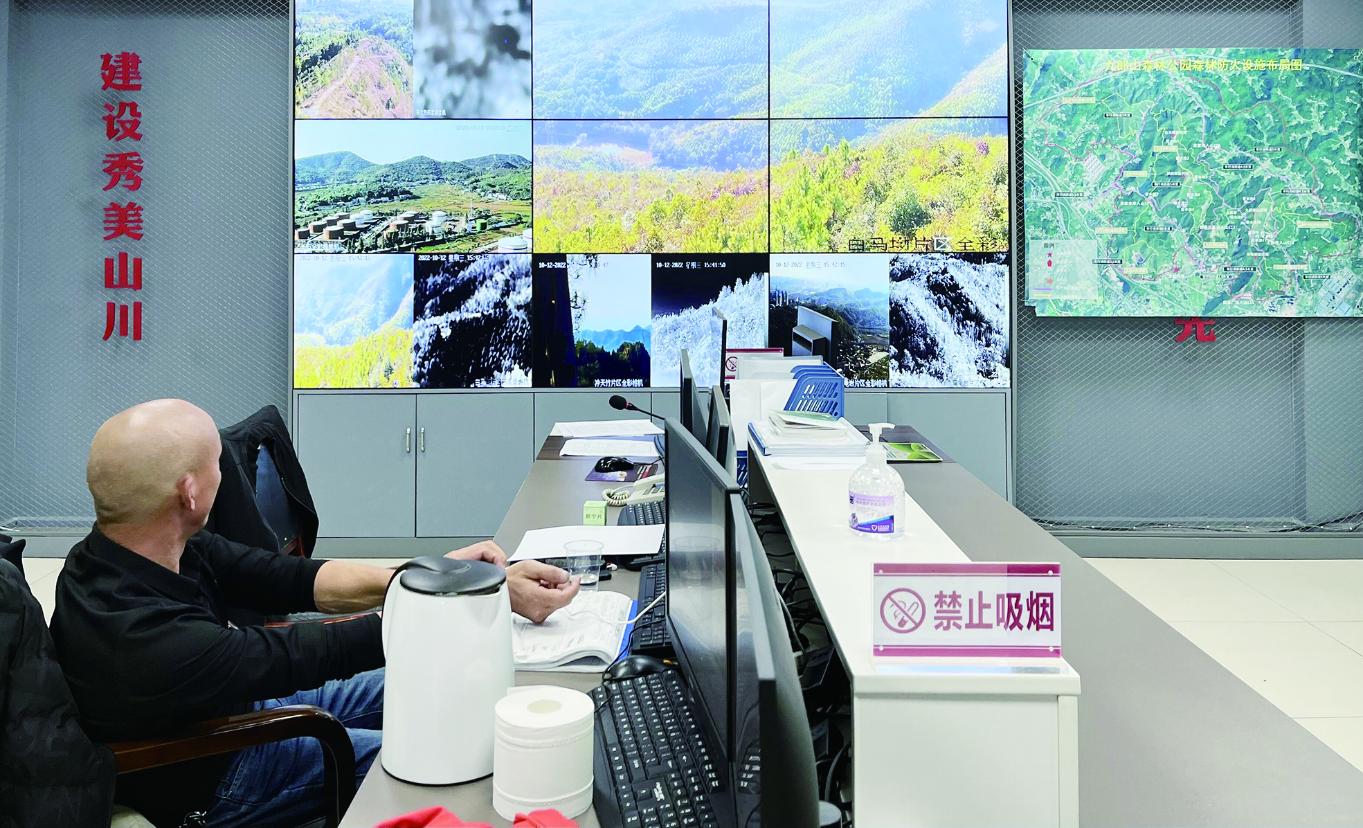 ▲值班人员通过“技防”手段对九郎山森林公园进行实时监控。记者/刘平 摄