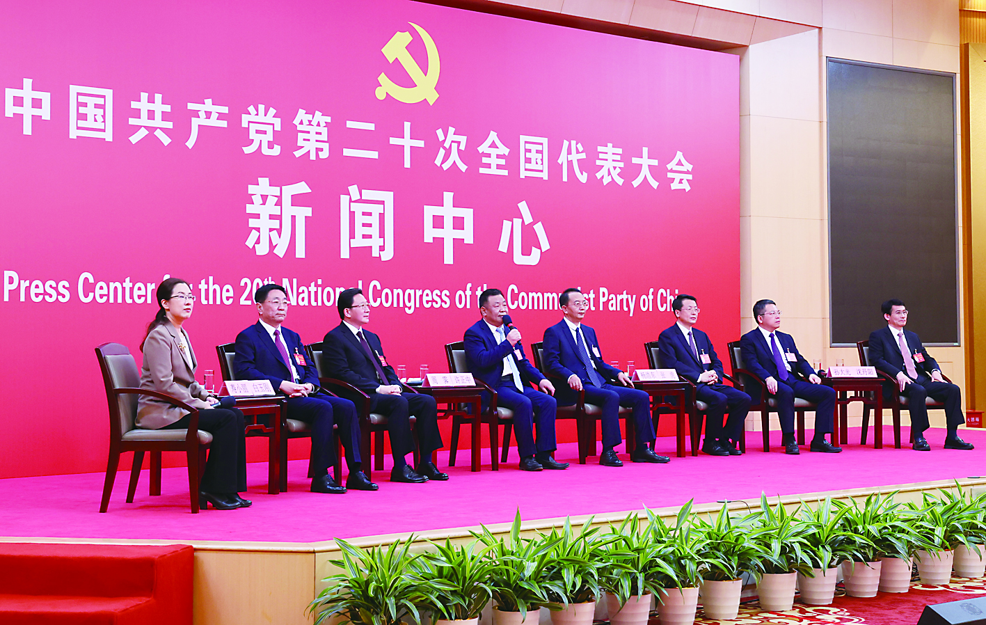 10月19日,中国共产党第二十次全国代表大会新闻中心举行集体采访。山东、河南、湖北、湖南、广东、广西、海南代表团新闻发言人出席,介绍代表团学习讨论二十大报告情况,并回答记者提问。 新华社记者 张玉薇 摄