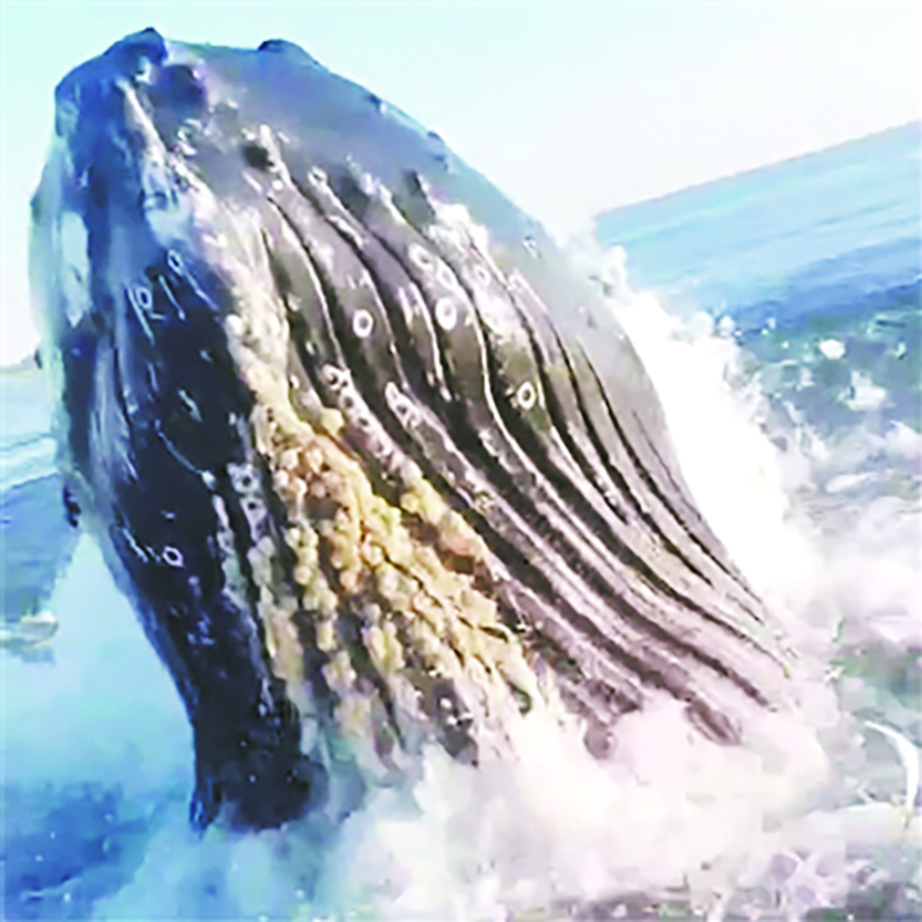 鲸尾拍打到了船,船前后摇晃起来。没有人受伤。