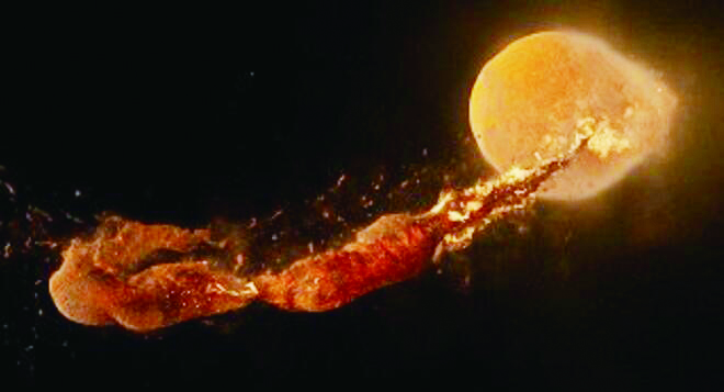 ▲模拟显示,月球由被抛出的地球碎块和忒伊亚碎片形成。(图片来源:美国太空网)