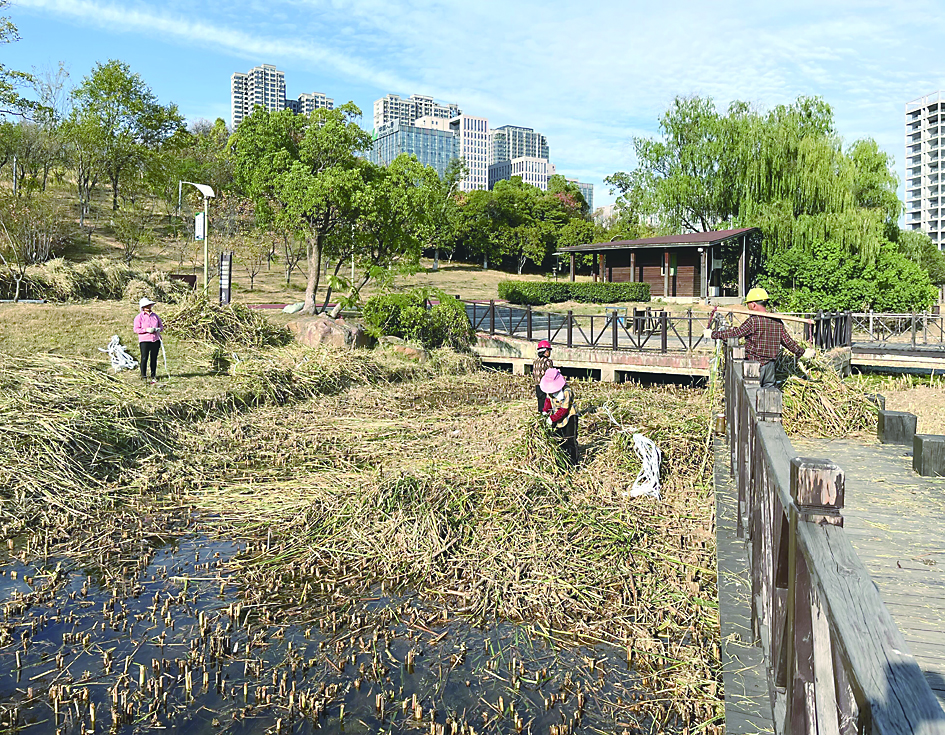 10月20日,神农城景区的芦苇丛里,几名工人正在对芦苇实行人工割除。