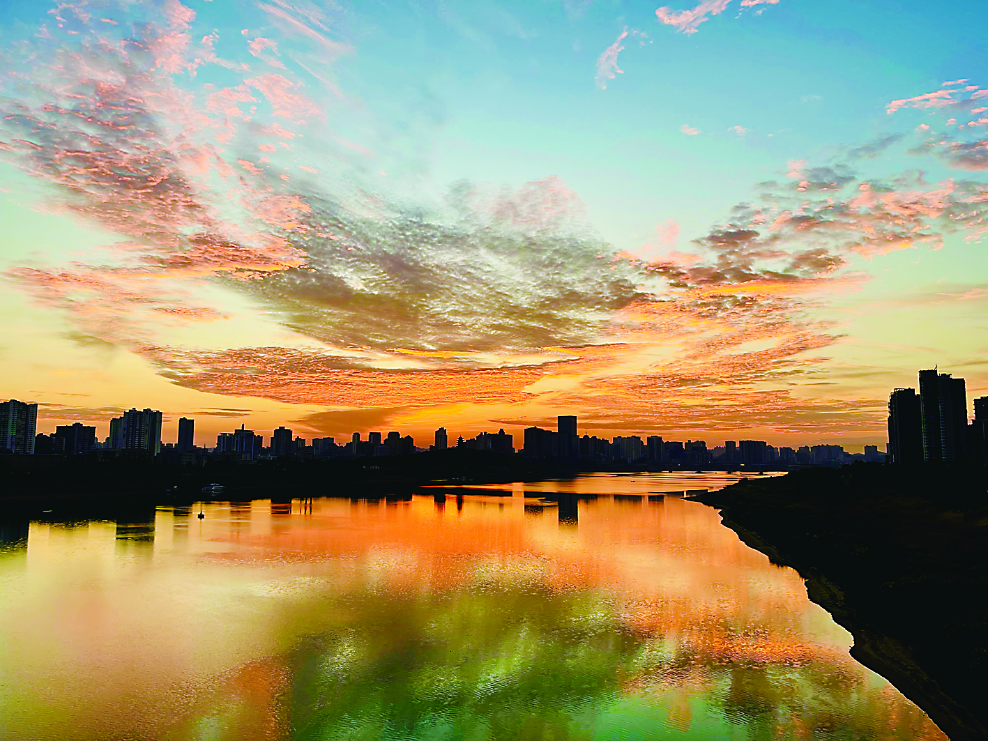 10月20日清晨,河西湘江风光带,桔红色的朝霞与蓝天碧水交相呼应,宛如一幅水彩画令人心醉。株洲晚报融媒体记者/马文章 摄影报道