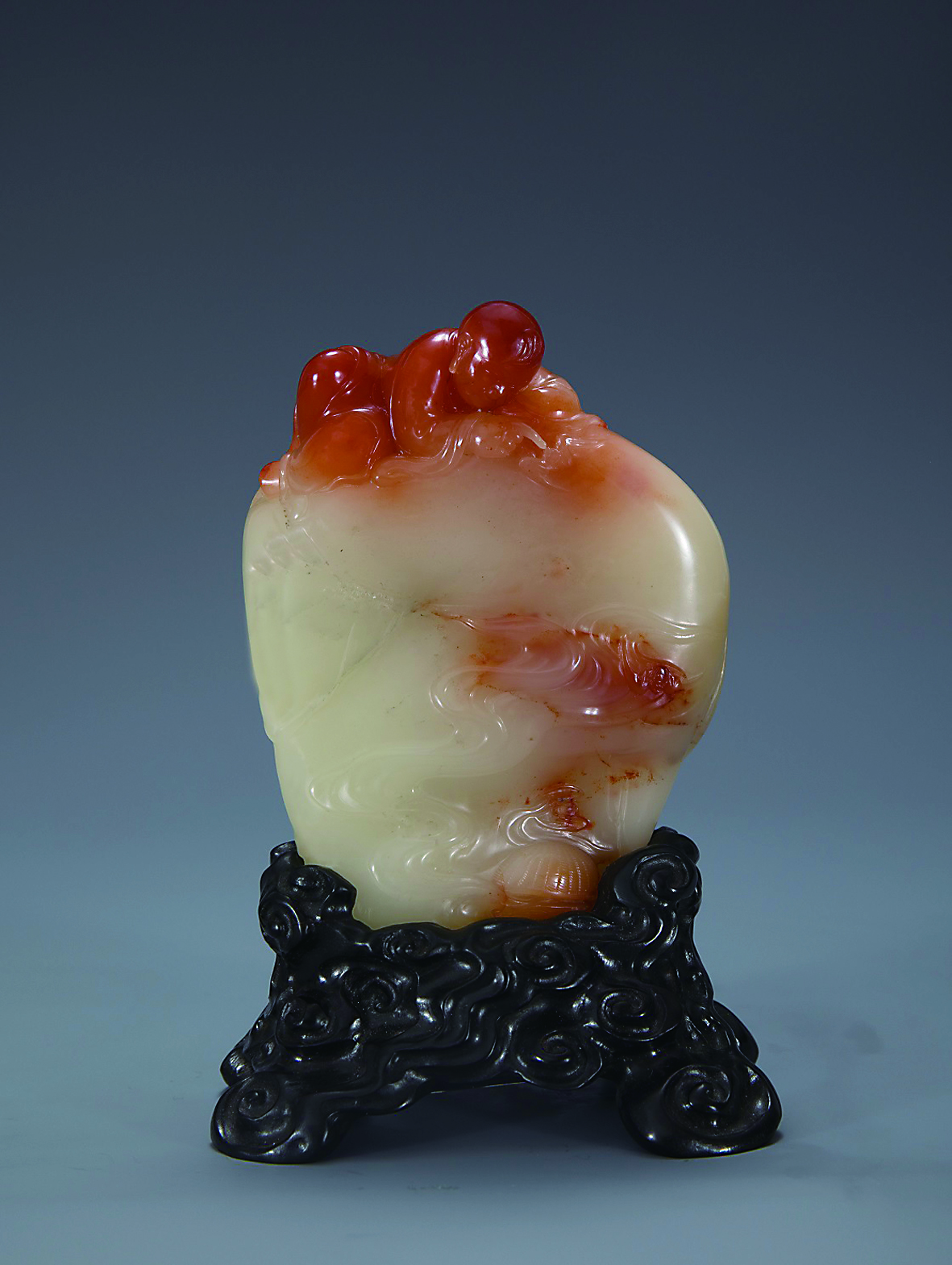 寿山石雕是以福建寿山出产的叶蜡石为原料,经过精心雕刻而成的工艺品。寿山石雕造型有着人物、花果、动物、山水风景、印章,为福建工艺品“三宝”(脱胎漆器、寿山石雕、角梳)之一。寿山石历经逾千年,以它独特的意蕴,构成了内涵丰富的“寿山石文化”。而寿山石文化又与中国传统的诗、书、画文化内涵密不可分,自古至今,许多文人雅士都将自己的情感寄托于寿山石的意境之中。郑幼林自觉承续石雕传统题材与技法,并将其他雕刻手法、造型方式与审美追求融入创作,不断探索新的技法。他的作品《福在眼前》利用石材原本的色彩分布巧妙地将顶端和中间些许的红色雕刻成幼童和蝙蝠,白色部分设计成云海。蝙蝠在幼童前飞舞,寓意主题。作品体现了“精致和谐、美善统一”的人文价值,不仅仅包含刀工技法,更充满了精神上的感染力,给人赏心悦目的享受。(本报综合)