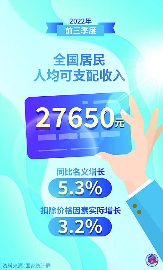 居民收入平稳增长,农村居民收入增长快于城镇。前三季度,全国居民人均可支配收入27650元,同比名义增长5.3%;扣除价格因素实际增长3.2%。按常住地分,城镇居民人均可支配收入同比名义增长4.3%,实际增长2.3%;农村居民人均可支配收入同比名义增长6.4%,实际增长4.3%。
