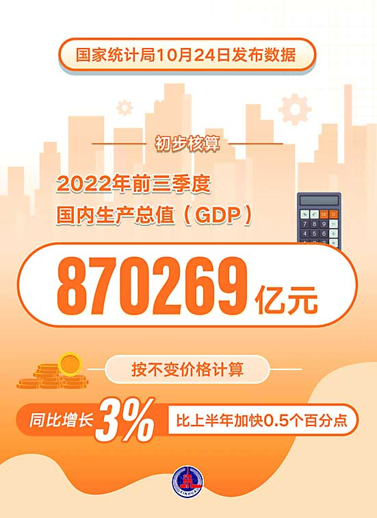 国家统计局24日发布数据,初步核算,前三季度国内生产总值(GDP)870269亿元,按不变价格计算,同比增长3%,比上半年加快0.5个百分点。