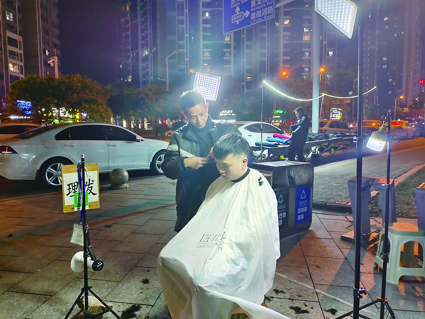 夜幕降临,栗雨休闲广场华灯初上,人流开始汇聚。孟先生架起支架接通电源,摆上凳子,一个简易的理发摊就布置完成了。