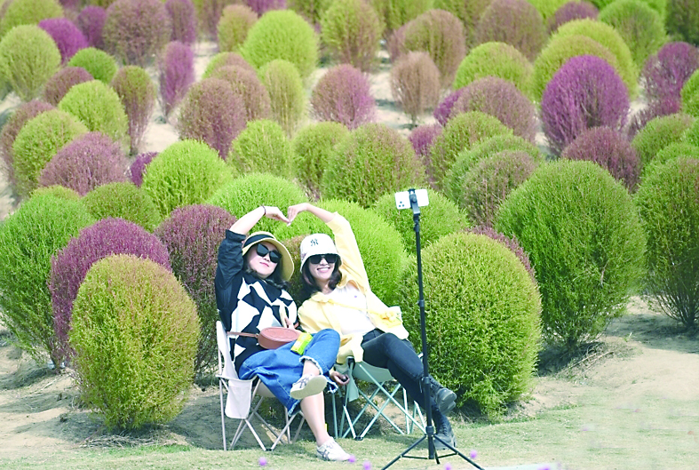 10月24日,游人以“网红”地肤草为背景拍照。秋季的杭州径山花海进入盛花期,醉蝶花、千日红、波斯菊等十余个品种的鲜花盛放,姹紫嫣红吸引游人“打卡”赏景。