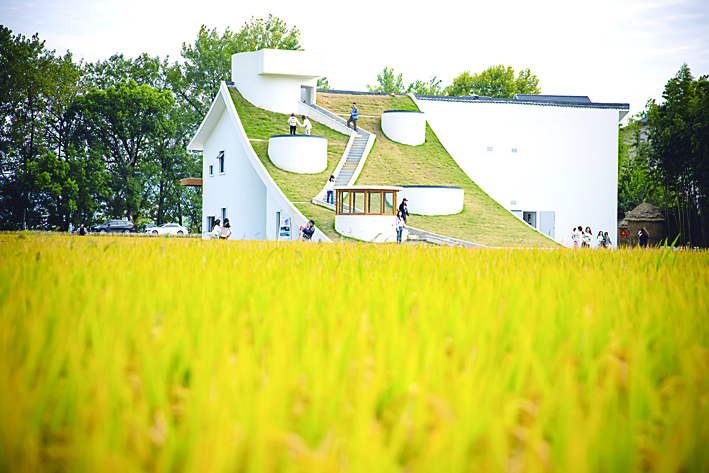 这是10月25日拍摄的桐庐县桐君街道梅蓉村的稻田与乡村会客厅。 近日,浙江省杭州市桐庐县的乡村里稻田金黄、丹桂飘香,展现出美丽的金秋画卷。
