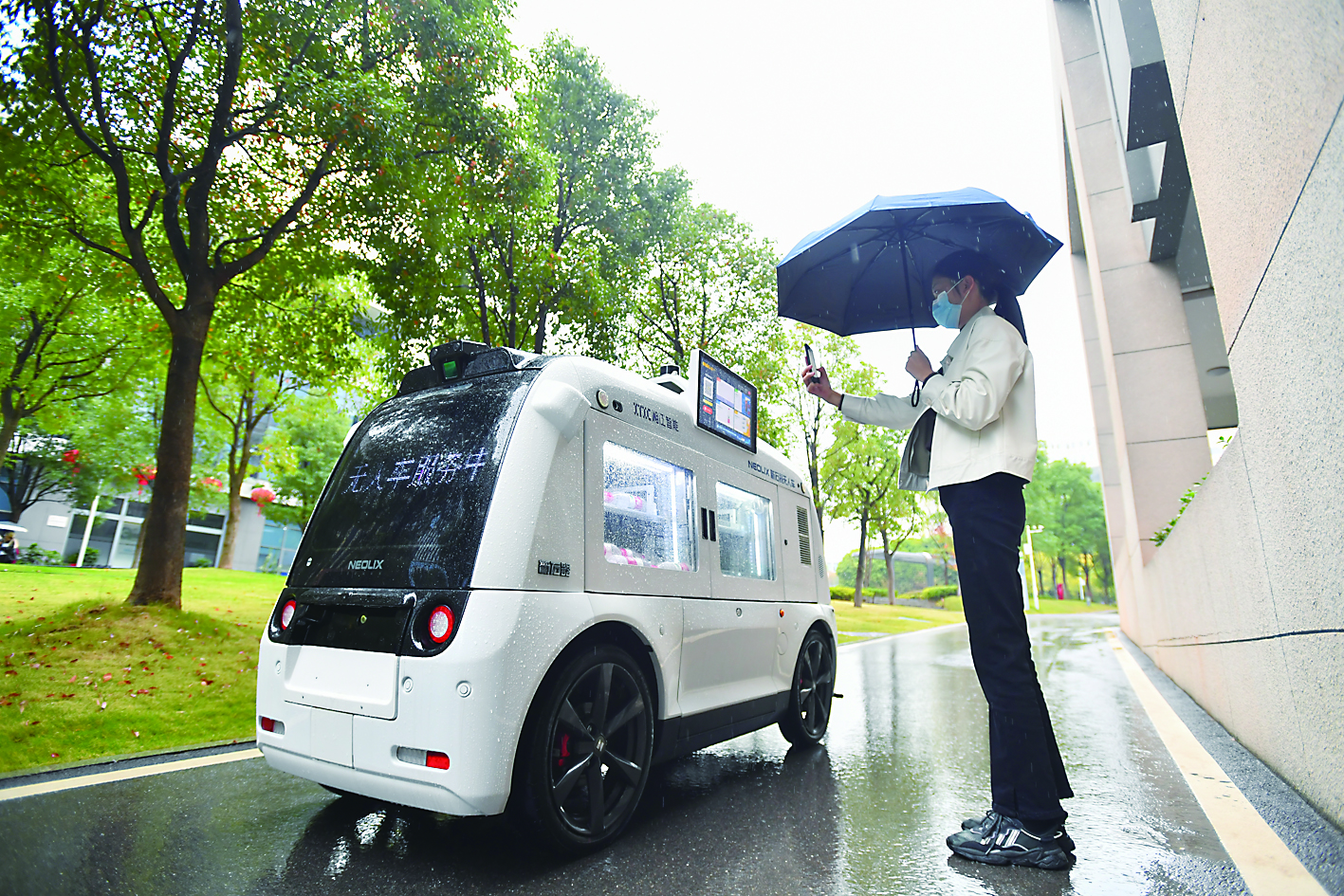 10月27日,在湖南湘江新区的湖南省检验检测特色产业园内,园区员工对着无人驾驶零售车扫码挑选商品。 近日,多台无人驾驶零售车在湖南湘江新区的湖南省检验检测特色产业园内试运营。无人驾驶零售车按照规划的线路行驶,其货柜可容纳饮品、食物等,并具备冷藏、制热功能,为园区员工提供便利的“无接触”购物方式。