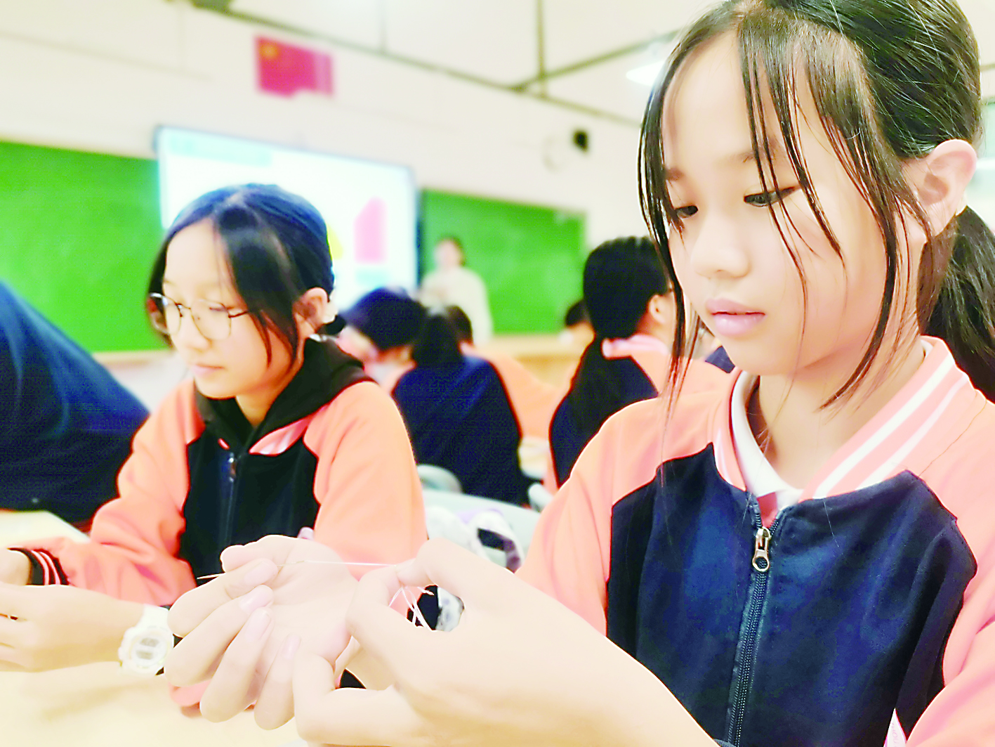 ▶同学们在小心翼翼地穿线。 记者/戴凛 摄