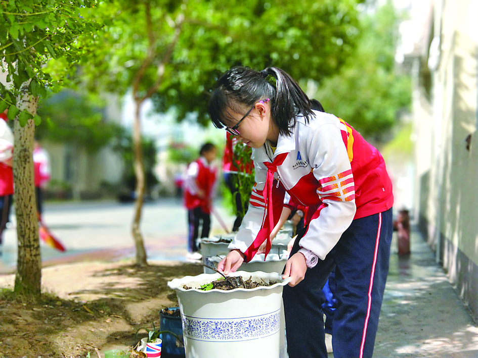 ◀小记者在整理花盆。 校方供图